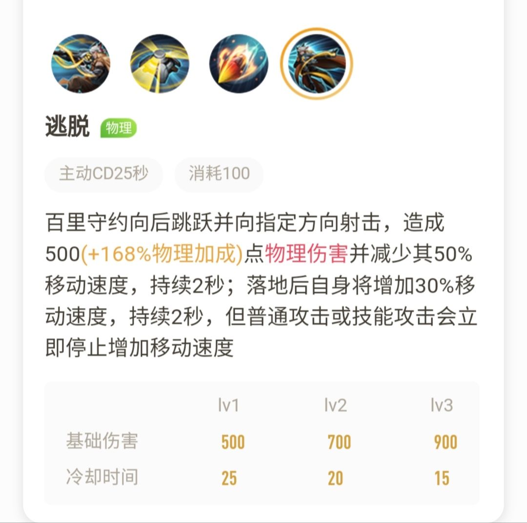 守约向后跳跃并向指定方向射击,造成500(+1 68%物理加成)点物理伤害并减少其50%移动速度,持续2秒;落地后自身将增加30%移动速度,持续2秒,但普通攻击或技能攻击会立即停止增加移动速度