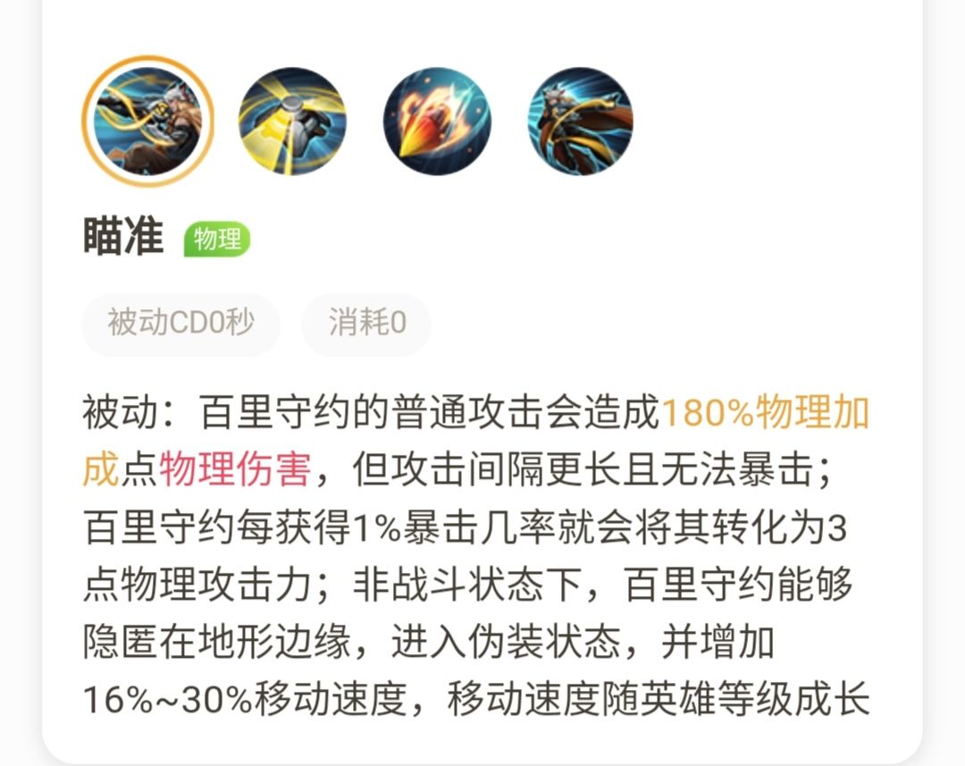 守约的普通攻击造成180%物理加成点物理伤害,百里守约每获得1%暴击几率就会将其转化为3点物理攻击力;非战斗状态下,百里守约能够隐匿在地形边缘,进入伪装状态,并增加 16%~30%移动速度,移动速度随英雄等级成长。我们整理可得出: