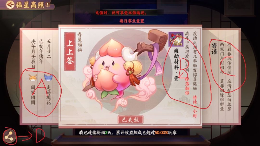 B:这里面是今天抽到的是什么签主要分为:抽卡、通宝、经验、渡劫、庙会。