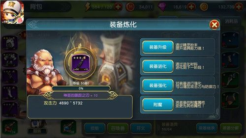 对战力提升影响最大的莫过于装备。装备分5种品质,依次是绿、蓝、紫、金、红这五种颜色,不同品质的装备对战力的提升效果不一样。另外装备还可进行炼化操作,具体又可分为:升级、进化、强化和附魔。