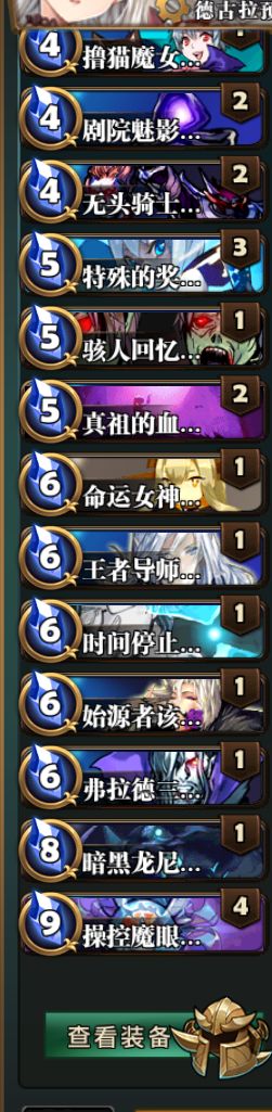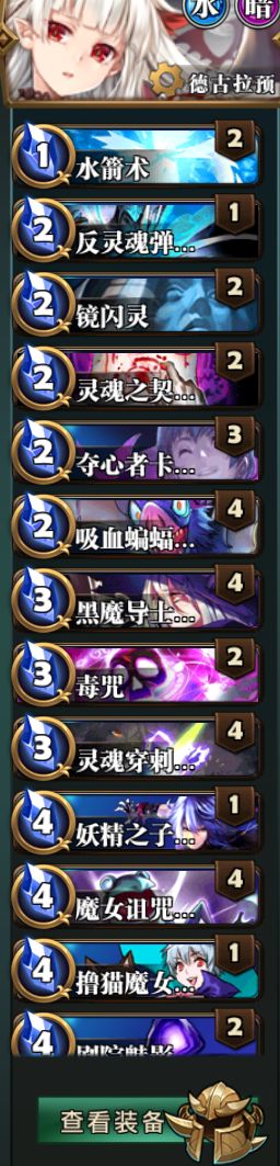 水箭术带一俩张,有奇效,其他的可以自己看看怎么带,龙防身,骇人回意最好还是带一张核心是魔女的诅咒和操控之灵,其他的牌都是过的。