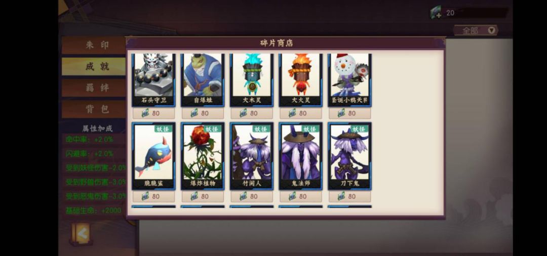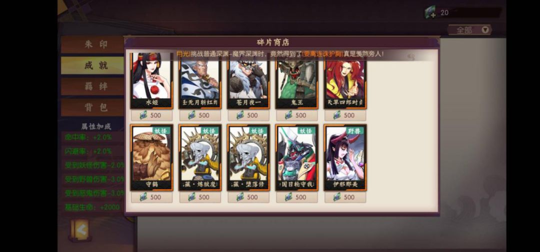 由图可知,兑换每一类所需要的朱印碎片也是不同的,越高级的所需要的碎片越多。分解碎片只能获得朱印碎片价值的80%。比如价值五百朱印碎片的水姬碎片直接出售只能获得400朱印碎片。朱印碎片可以兑换一切朱印的碎片卡。
