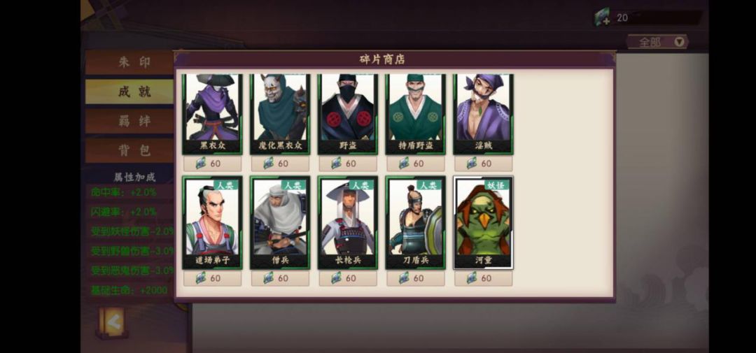 通用可分解朱印卡片(加命中率闪避率一类的属性):地藏·堕落修罗,癔病神,百目,奈奈,斗笠女刺客,侍,浪人,虚无僧,失心武士,妖僧,竹闲人,鬼法师,刀下鬼,刀流亡军,十手流亡军,战斗艺姬,巫女,道场弟子,僧兵,刀盾兵,长枪兵,蛤蟆仙,山童。