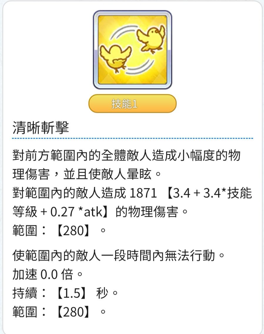 对前方280范围内全体敌人造成物理伤害并眩晕1.5秒。(专武强化后可提升伤害倍率,延长眩晕时间至2秒并降低范围内敌方攻击力)