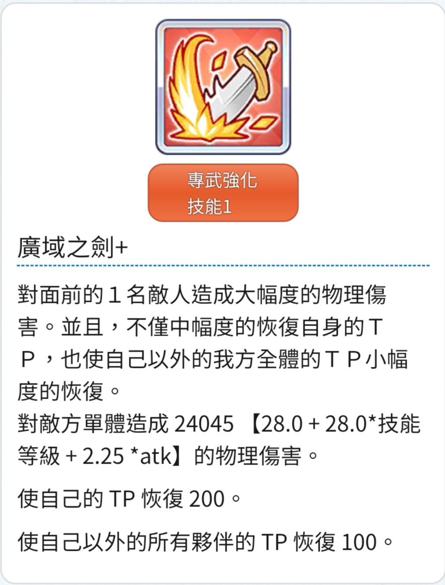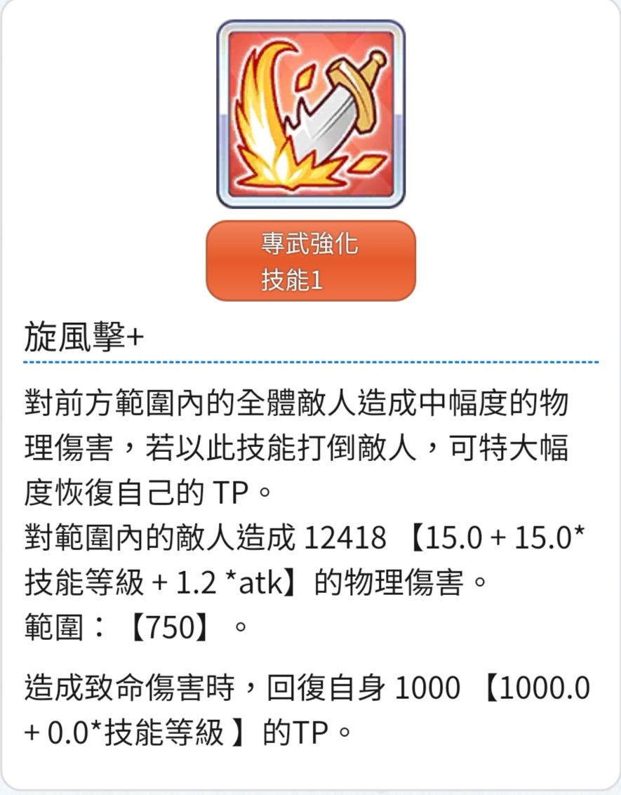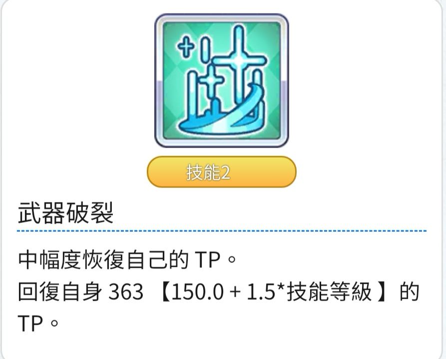 对面前一名敌人造成物理伤害。专武强化后,提高造成的物理伤害,并且使自己回复200Tp,除自身外,我方全体成员回复100Tp。