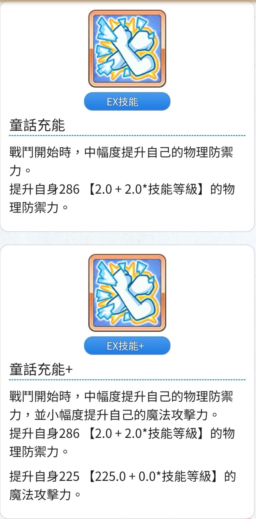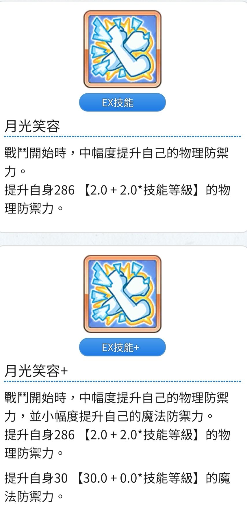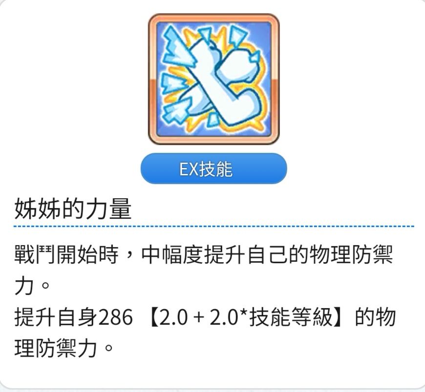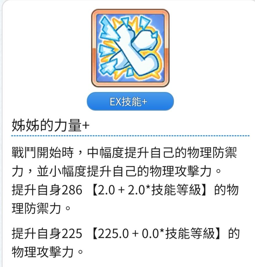 开场时提升自身物理防御力(EX+后额外提升自身小幅物理攻击力)。