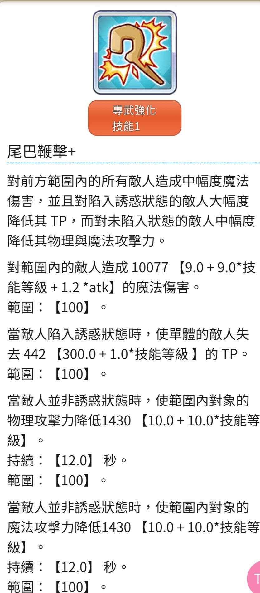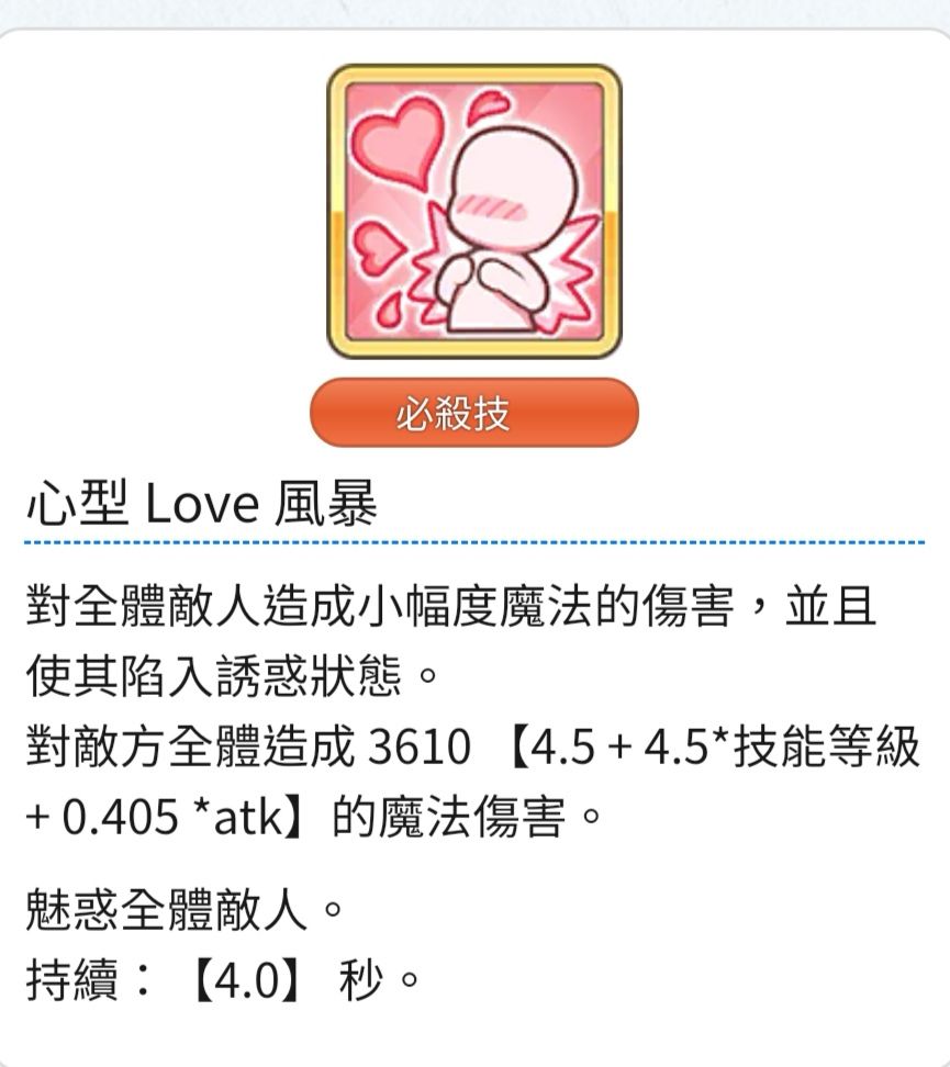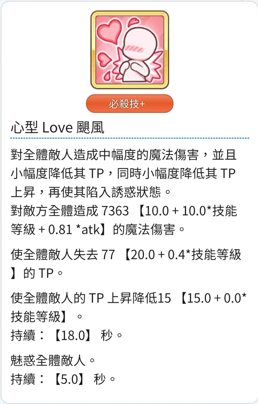 对敌方全体造成魔法伤害并陷入诱惑状态(4-5秒)。必杀技+效果提升,且会降低敌方全体tp和tp上限。