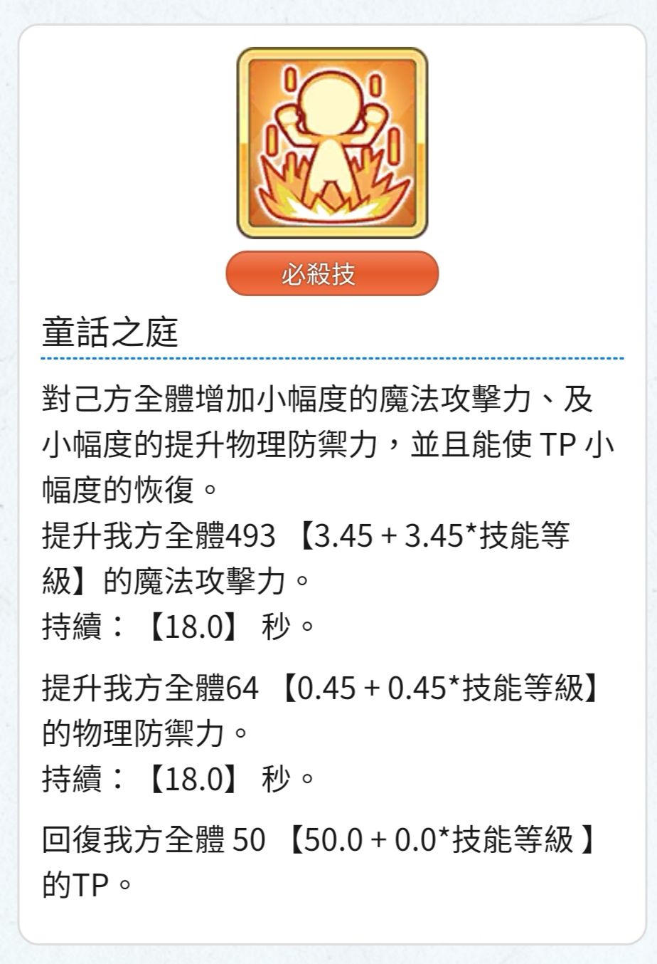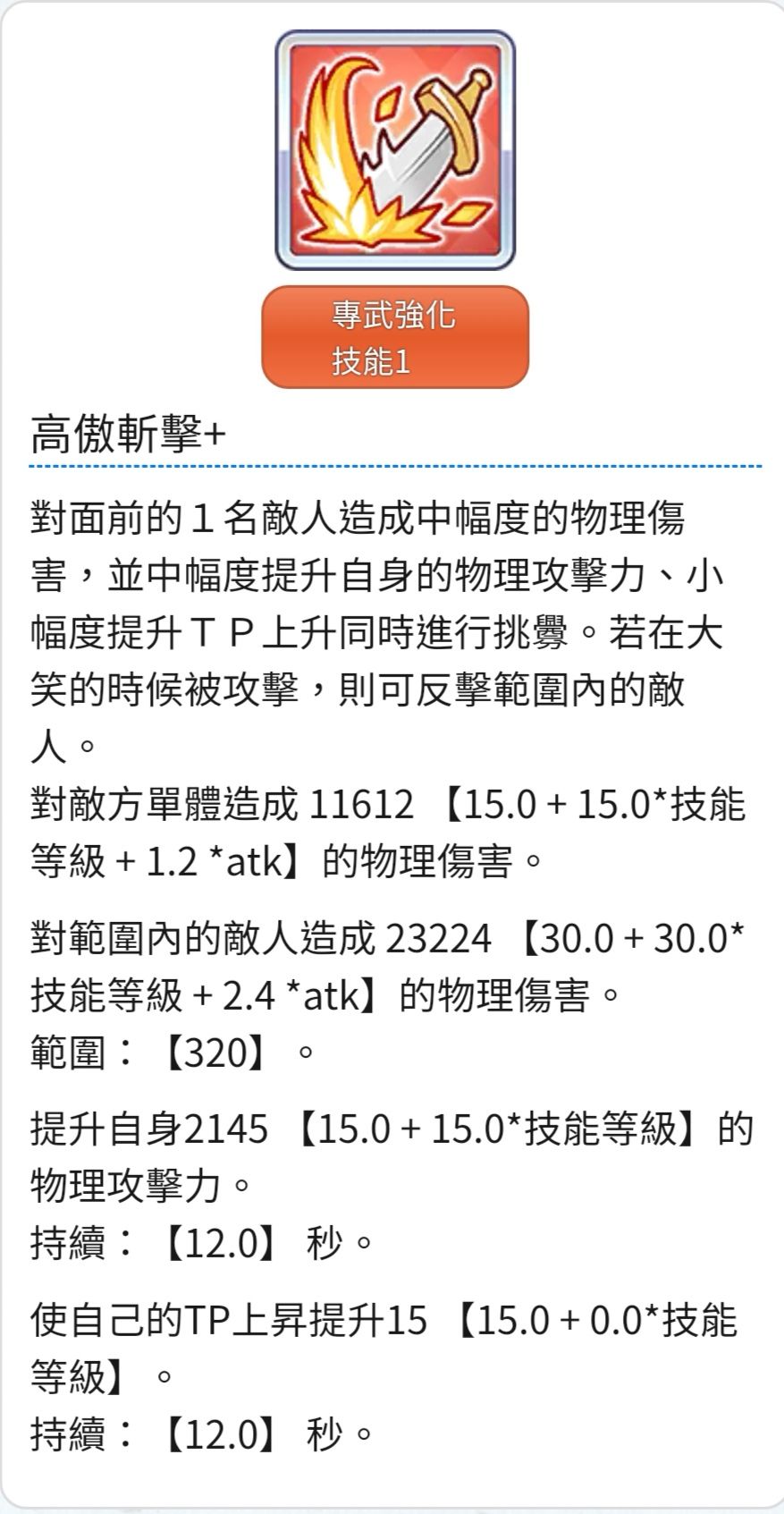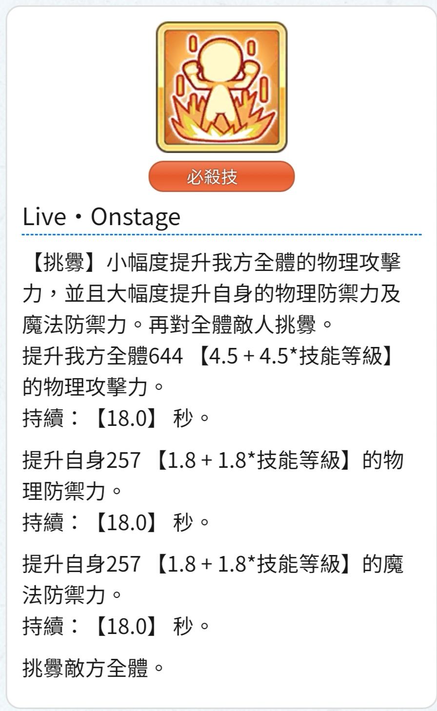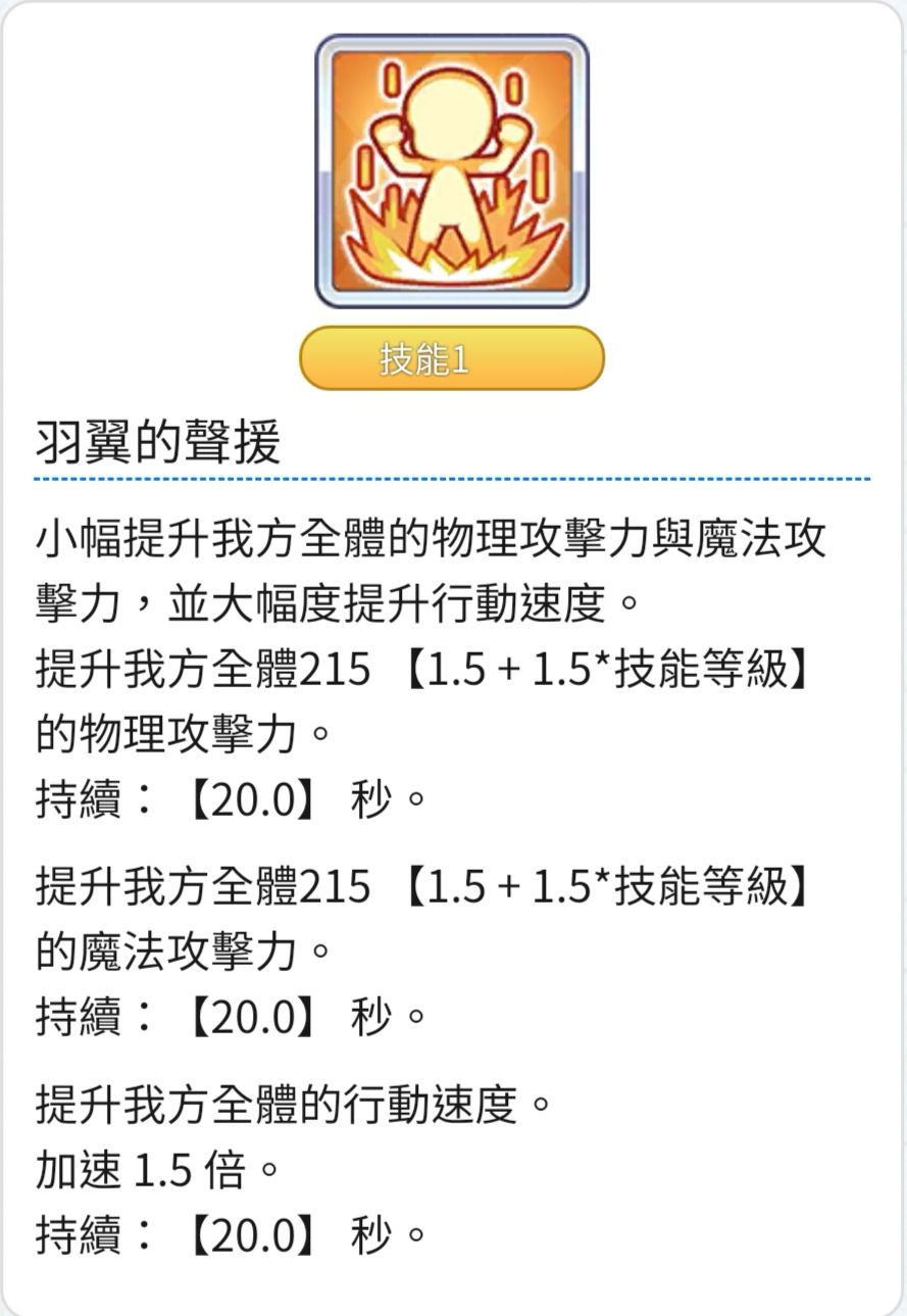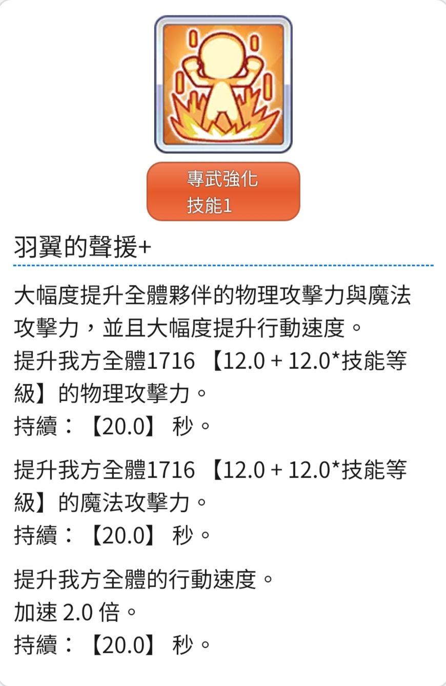 提升我方全体物理与魔方攻击力。并提升我方全体行动速度(1.5倍),每个效果持续20秒。专武强化后,攻击力提升倍率增加,加速2.0倍。