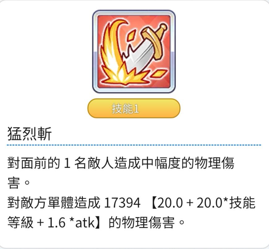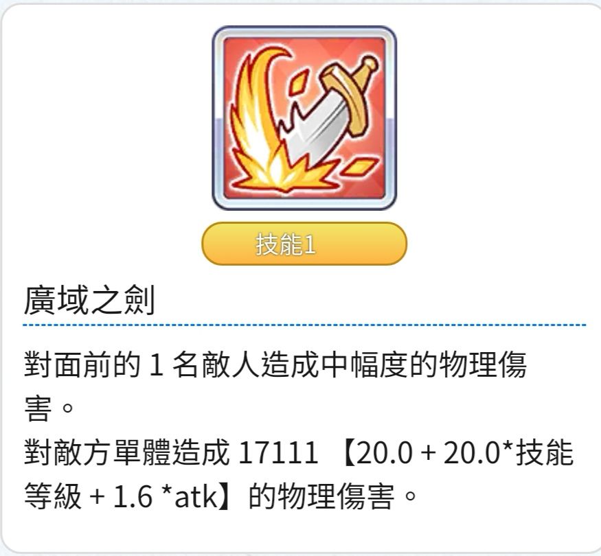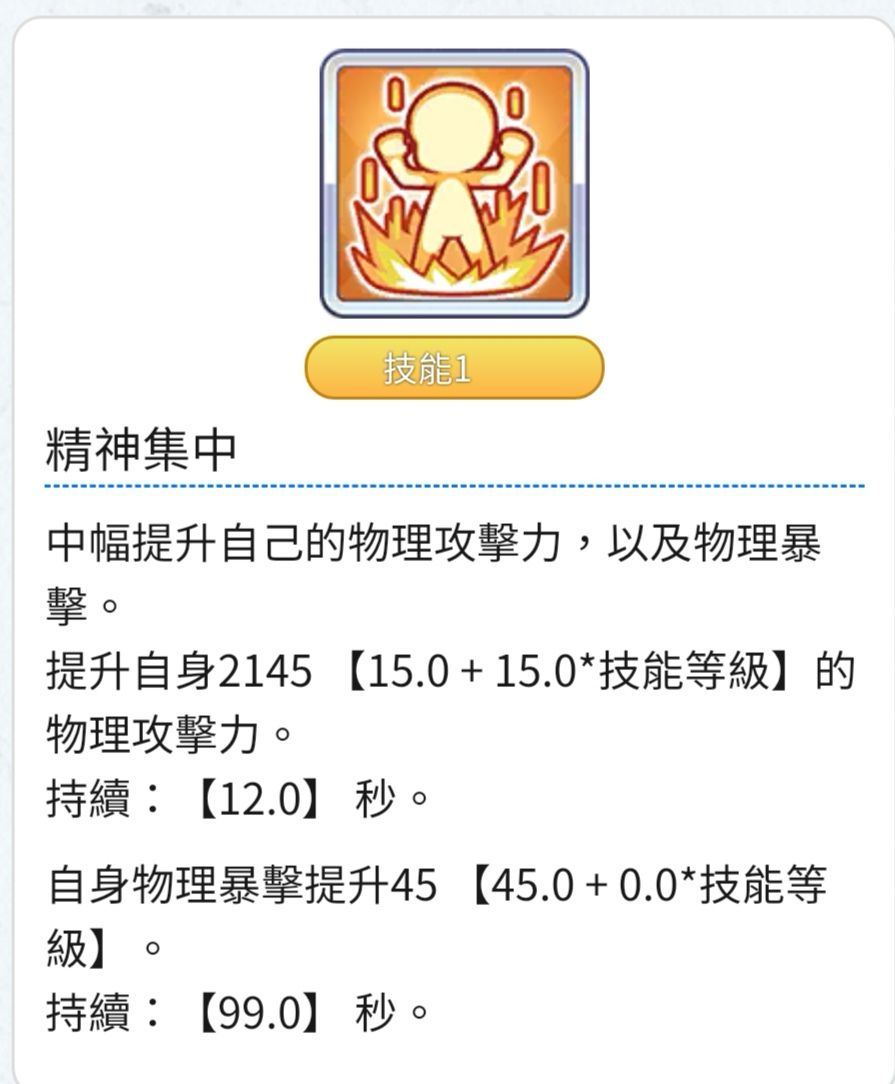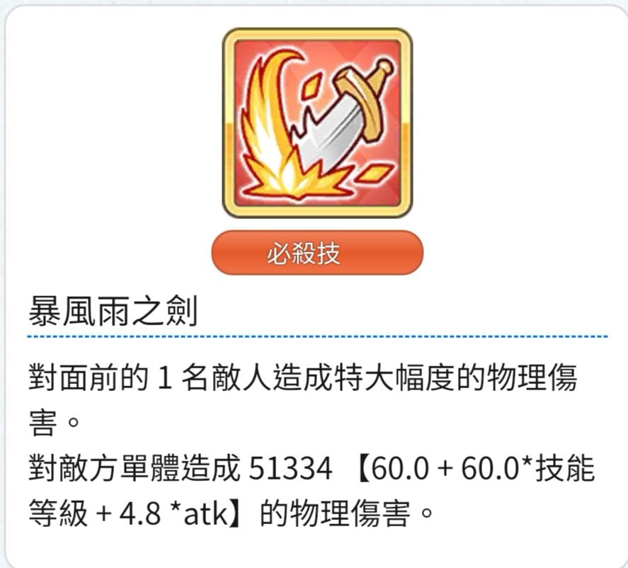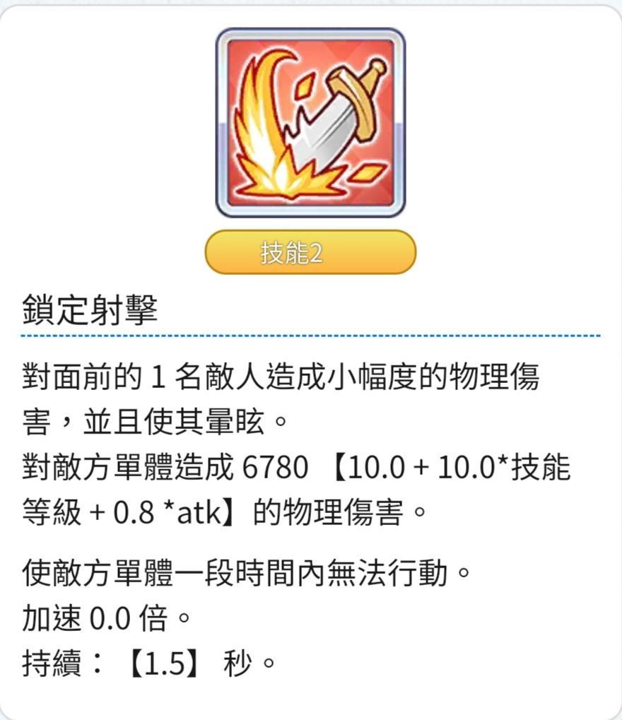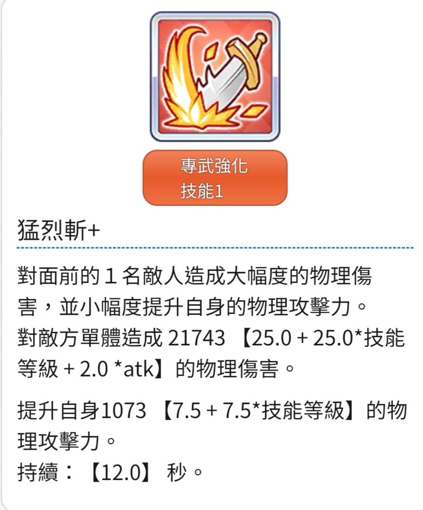提升我方全体物理与魔方攻击力。并提升我方全体行动速度(1.5倍),每个效果持续20秒。专武强化后,攻击力提升倍率增加,加速2.0倍。
