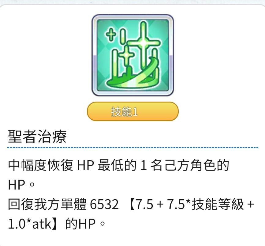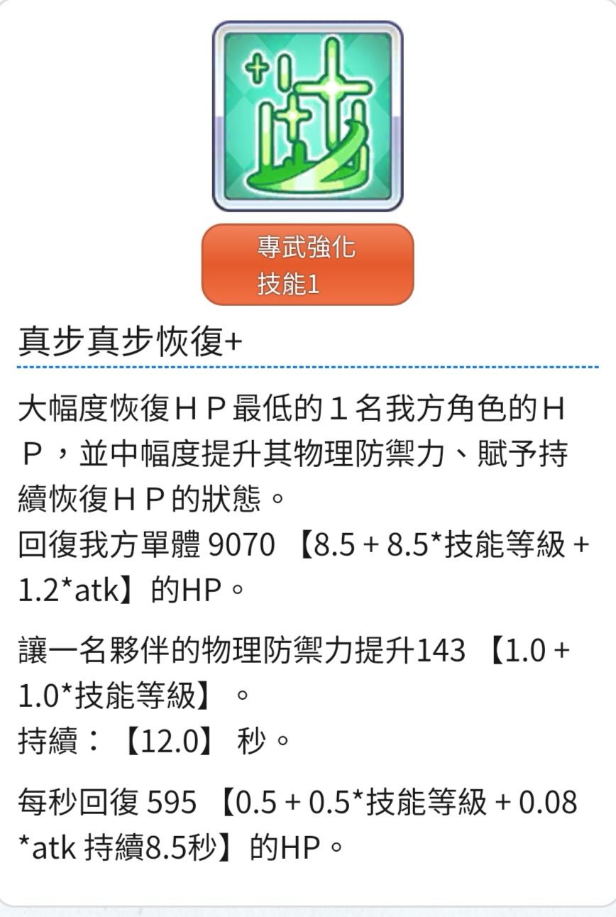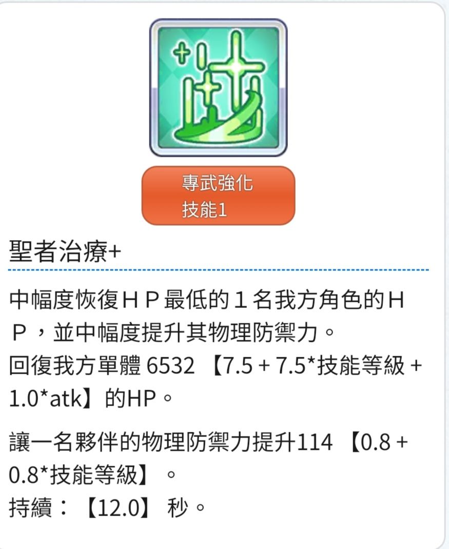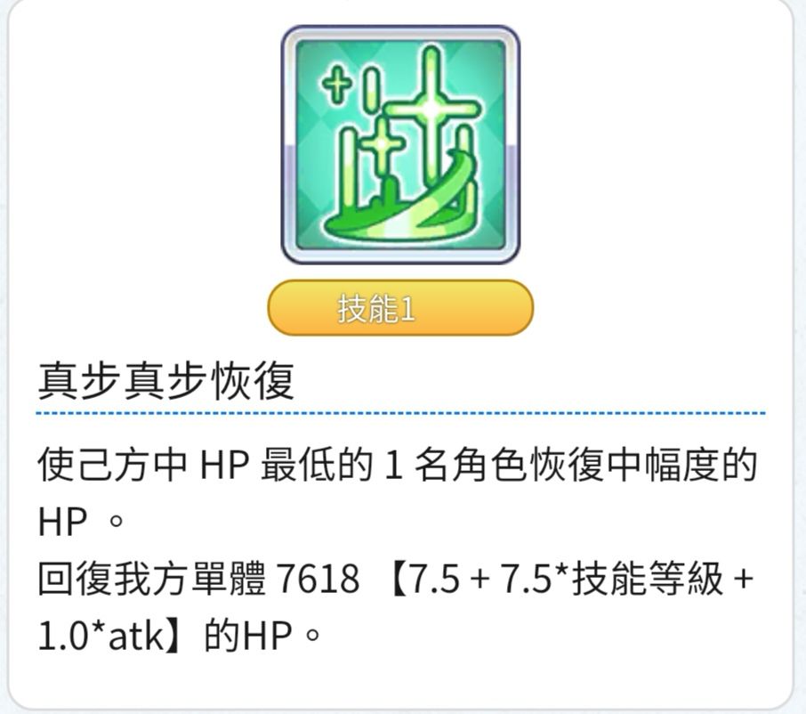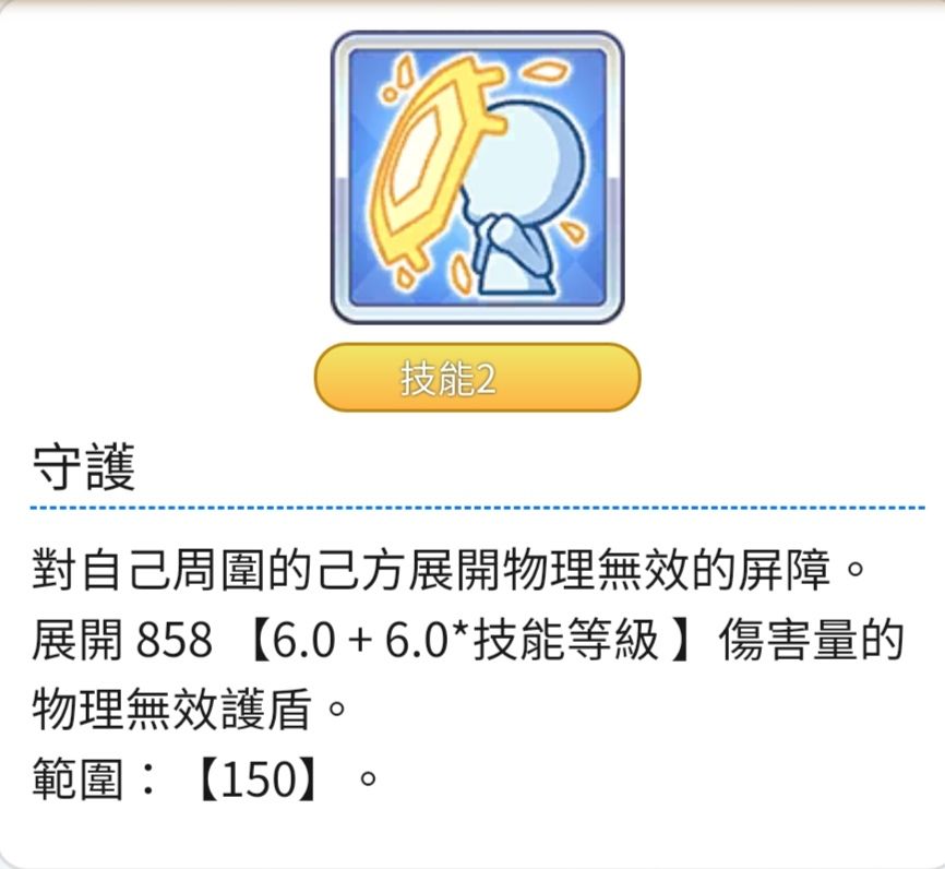 定位:单体奶,拥有物理护盾,在前期推图中可以捞起不少队友。虽然作为T身板略显单薄,但是拥有前卫中最末的站位。容易卡到推图小怪喜欢打的3号位。jjc中可以作为副T保护身后的中后卫输出。