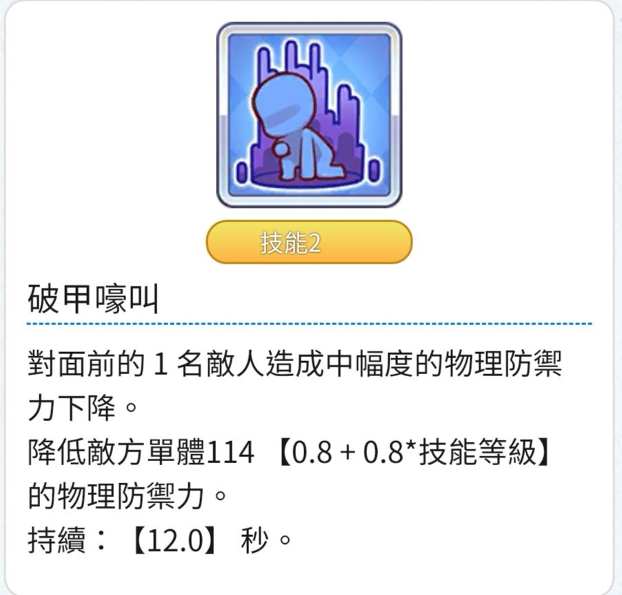 对面前一名敌人进行破甲,降低其物理防御力,持续12秒。