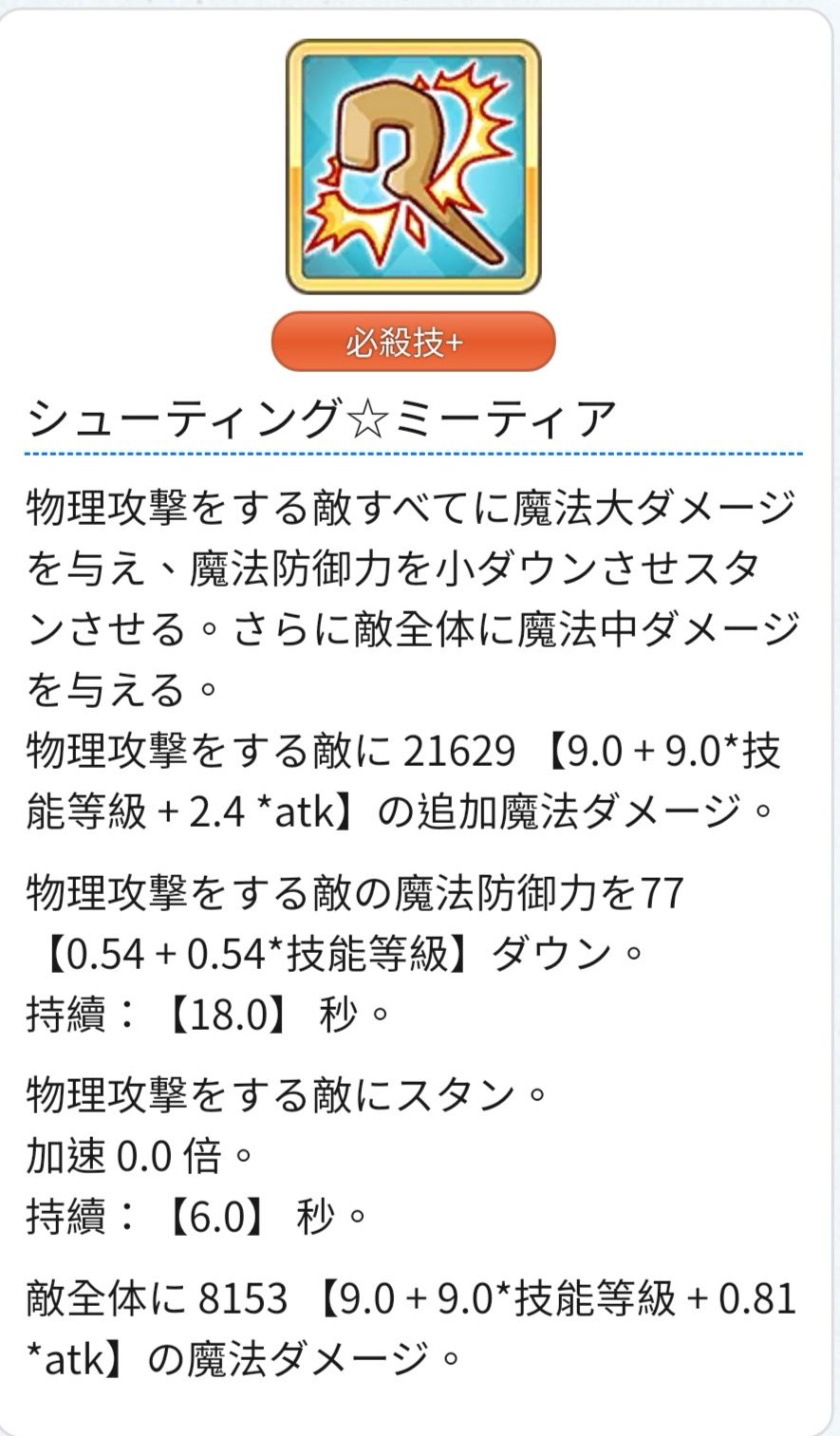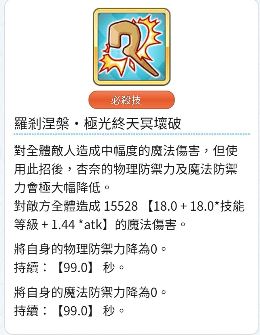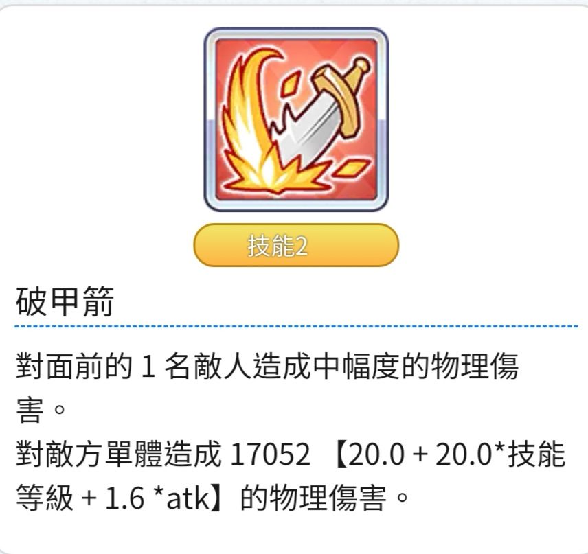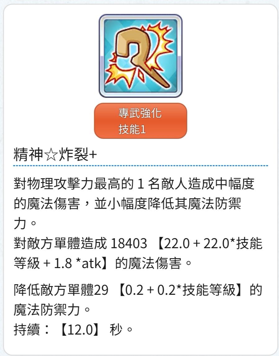 对敌方物理输出最高的单体敌人造成魔法伤害(专武强化后会额外追加对该敌人的魔方防御力降低效果)。