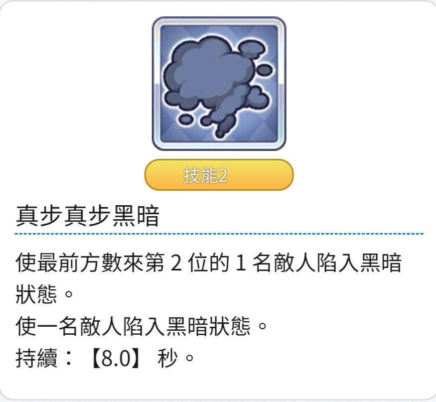 定位:频率低但高量单体奶。可以对敌方二号位致盲。限制敌方输出的同时可以提高自身T的生存能力。身板不错,推图时可作为末位T。