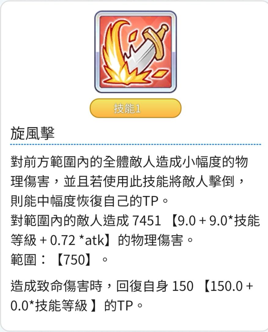 对前方750范围内敌人造成物理伤害,如果该技能击倒敌人则可以回复自身tp(专武强化后提升伤害倍率并且击倒敌人后大幅度回复自身Tp)。