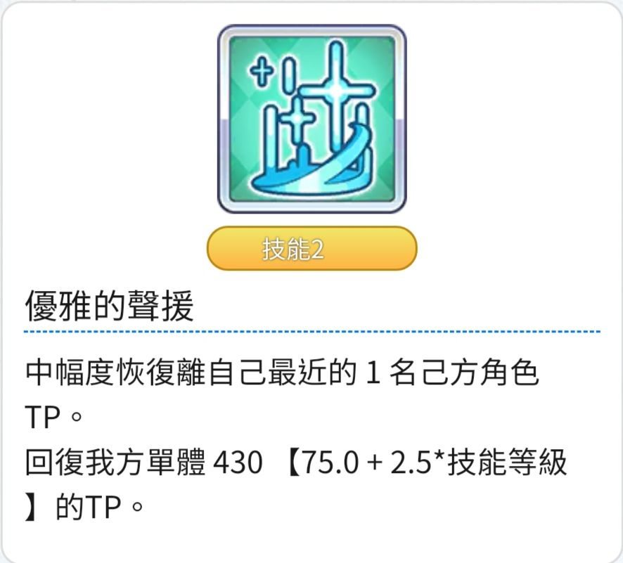 定位:拥有给自己站位最近的友方角色充tp的小技能。自身技能、ub是范围aoe技能。