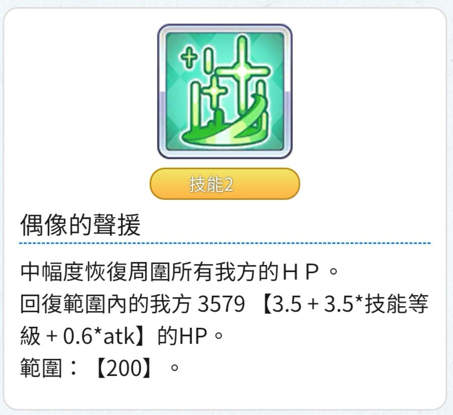 为我方生命值最低的友方单位回复生命值(专武强化后增加奶量,且为其提升物理防御力,持续14秒)