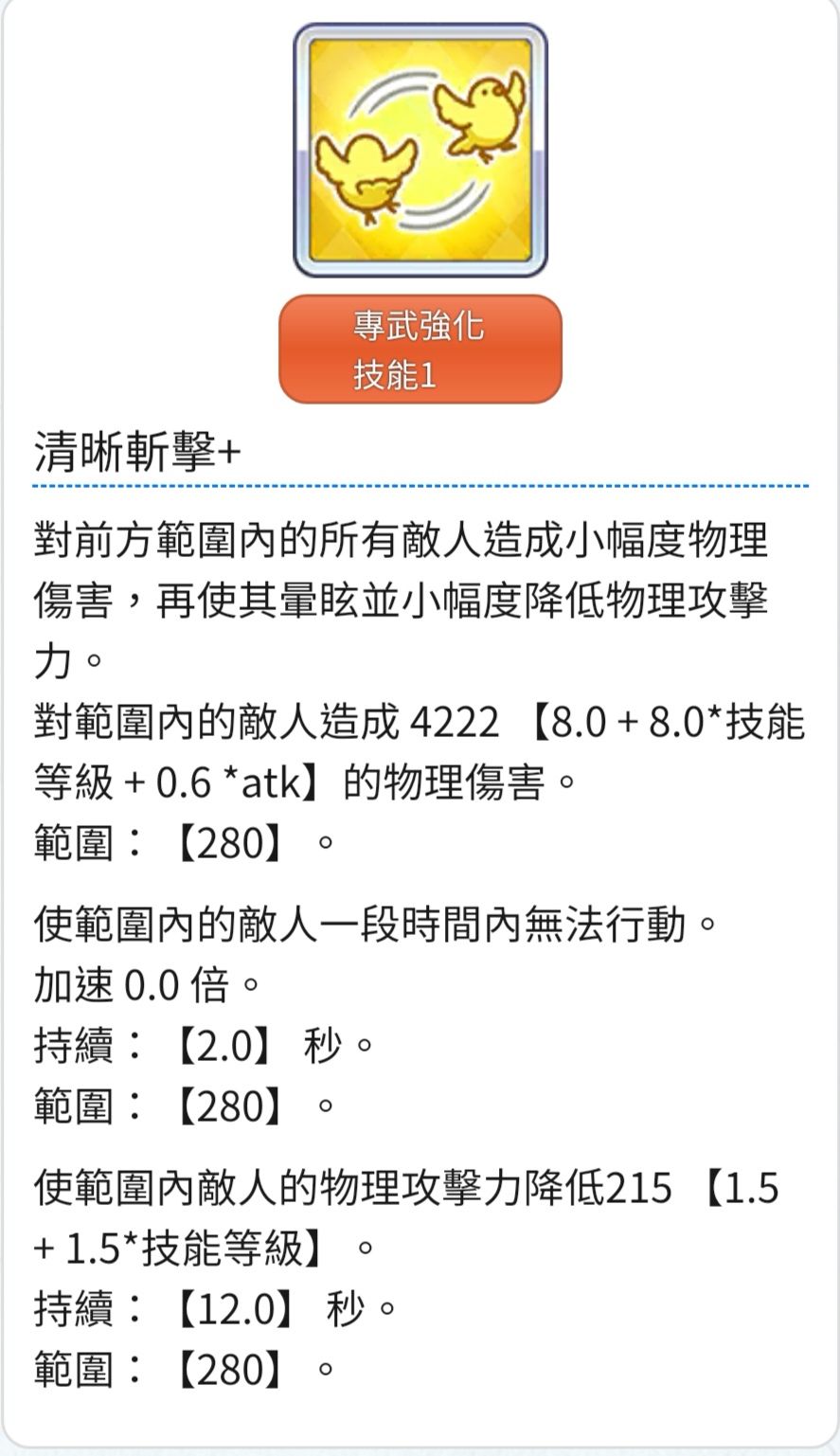 对面前一名敌人造成物理伤害(专武强化后提升物理伤害并额外提升自身物理攻击力)。