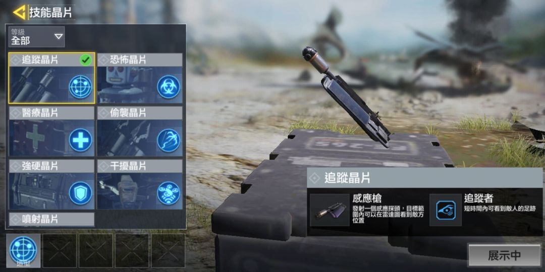 这个晶片的主动技能是丢一枚感应探头在地上可以把敌人显示在小地图上,二技能会在感应探头丢在地上时让范围内被侦测到的敌人走动时留下脚印,脚印的存留时间大约在7秒左右,这是一个非常不错的晶片,在决赛圈或者倒数第二第三个圈有奇效,堪称老阴比的末日。