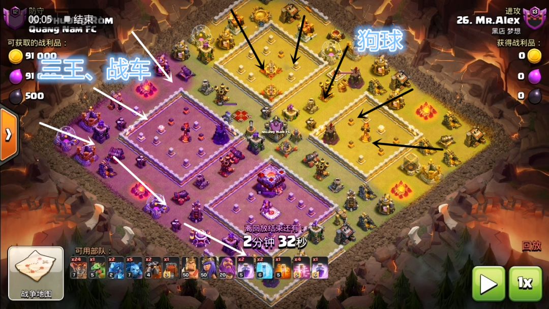三王从9点往6点方向进攻,战车爆掉以后打掉了法师塔防空和女王,这三个是非常关键的防御,之后三王消灭了联盟兵,为后续的狗球铺好了路,狗球进攻再无任何阻碍。