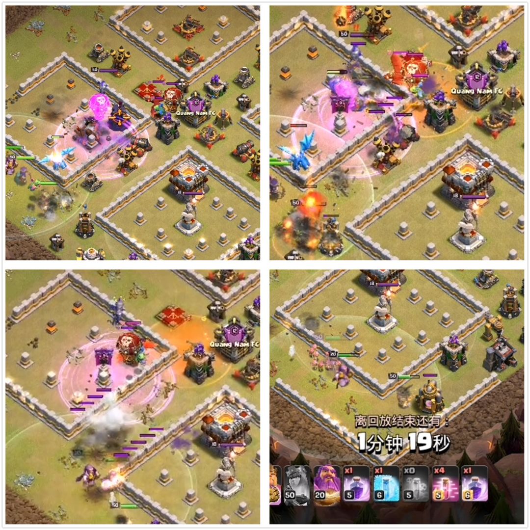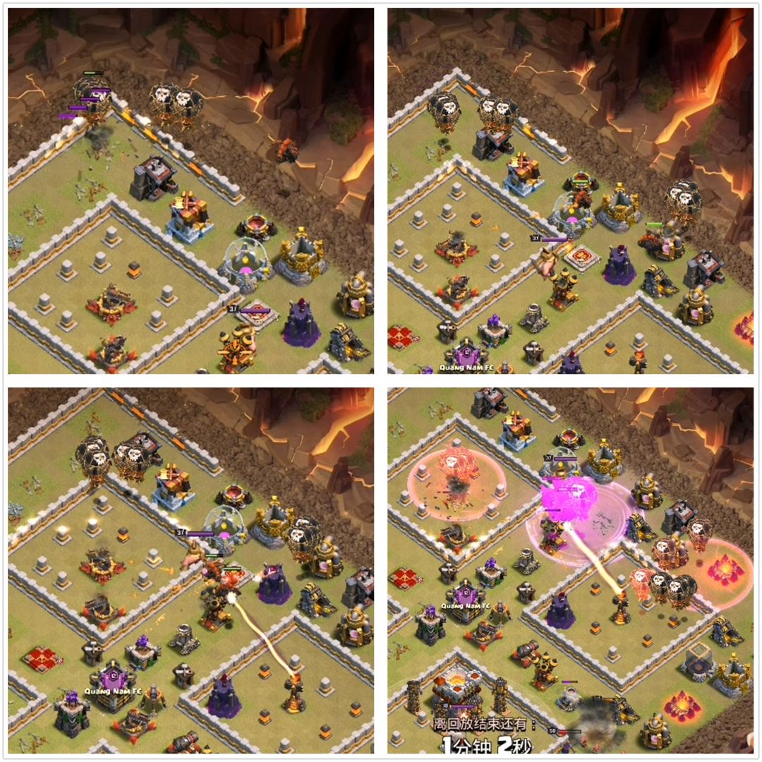 12点到3点方向下狗接球,之后补上狂暴法术和加速法术,虽然地狱塔已经是最高火焰来烧狗了,但是没有关系,我们还有不少气球马上进入到地狱塔的上空,消灭这一带的防御绰绰有余。