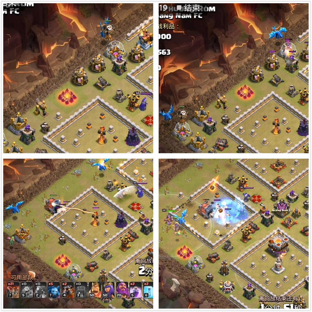 男王带领的陆空两路部队往最后的大本营那里前进,虽然大本营这里还有2个电磁塔,但是已经没啥太大的威胁了,因为我们手里还有5个气球。所以玩狗球的时候并一定不能全下,下兵前算好每个塔放几个球,算好了在放。切勿临时扔球,这样部队衔接一定出问题,即便防御塔清完,也有可能清不掉其他的建筑。