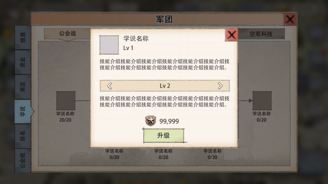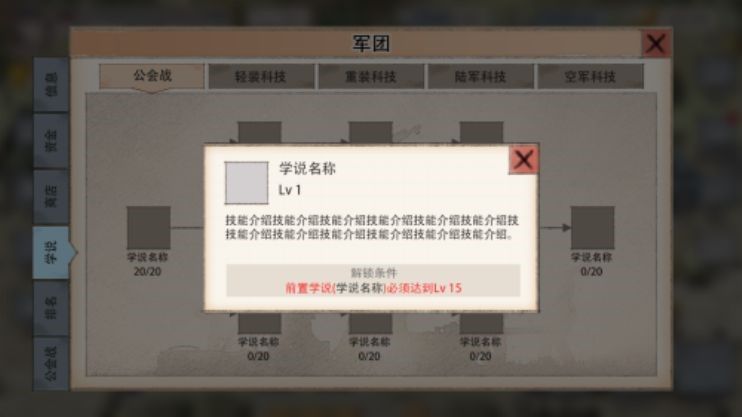 指挥官可以点击某个学说查看该学说的详细介绍和升级所需要的东西。