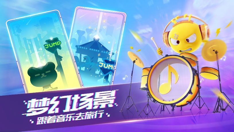 一段奇妙幻想的音“跃”旅程,一跃一世界,一乐一旅程。半悬空的建筑、文艺清新游戏画面呈现出来。从城市灯火辉煌的屋顶,到旋转着木马的游乐场;从金黄的麦田,到空中埃菲尔铁塔。你可以在这变幻的场景之间,步履不停。极简又不失精致的细节,质感满载的色彩搭配,成熟利落的节拍光柱,大大增加了沉浸式游戏体验。