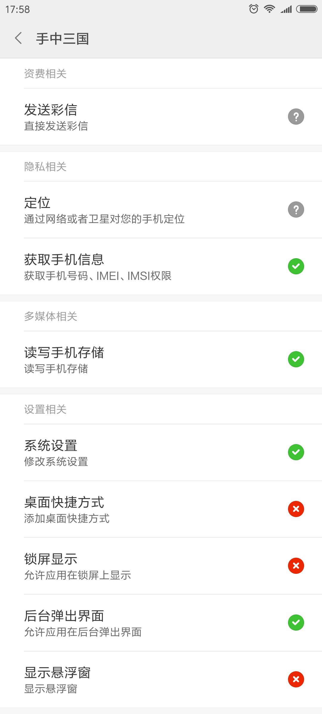 请打开手机的设置->权限管理,按照下图绿色对勾的权限进行设置