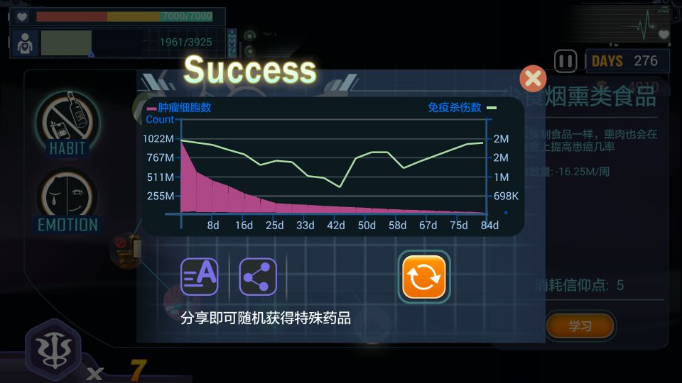 每周减少癌细胞,增加工资,一样重要。立刻降低癌细胞,体力增加,体力上限增加,降低扩散概率第二。免疫力这东西………但也跳不过……