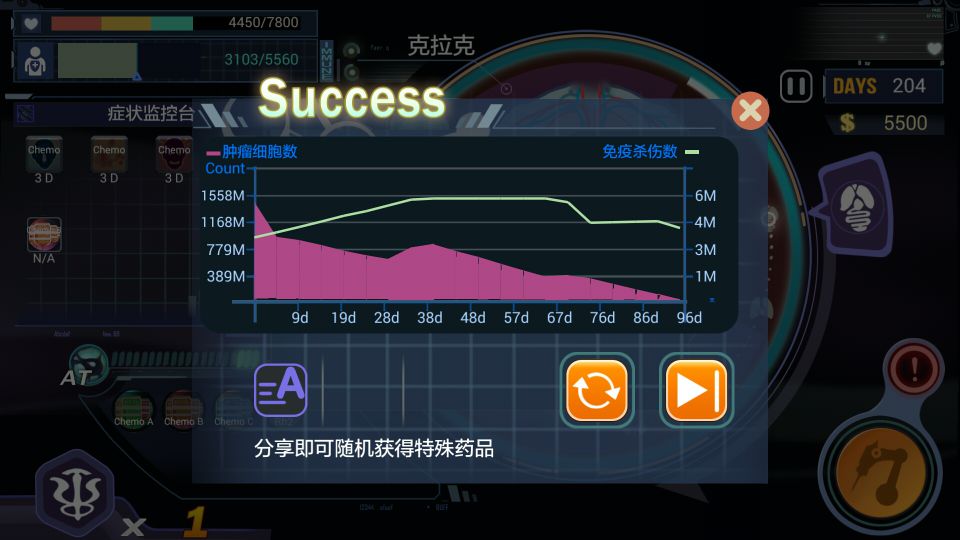 PS:下面图片分别是通关的病情发展和开局加点,前期的立刻下降都是放疗的功劳,后面的都是化疗的治疗。另外,开局 150工资,至关重要。