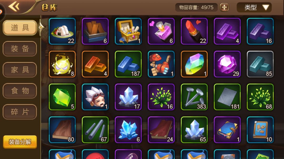 游戏内获得的所有道具、装备、家具、食物、碎片都在这里,记住,这也是装备分解的入口哦!!!