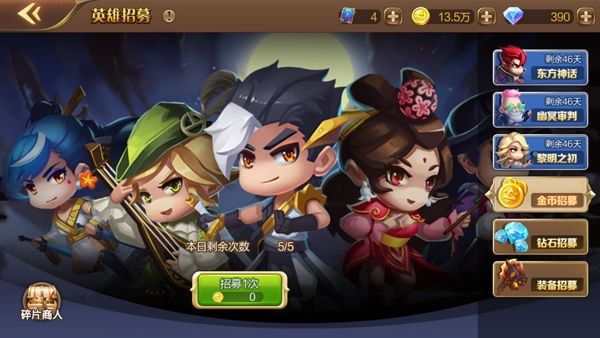想获取厉害的英雄?乘船进入招募岛或直接点大厅左下角的酒馆按钮。进入可看到有很多种招募方式:钻石、金币、招募券、碎片商人,即可用金币、钻石、招募券、英雄兑换券抽取或购买厉害的英雄与武器。