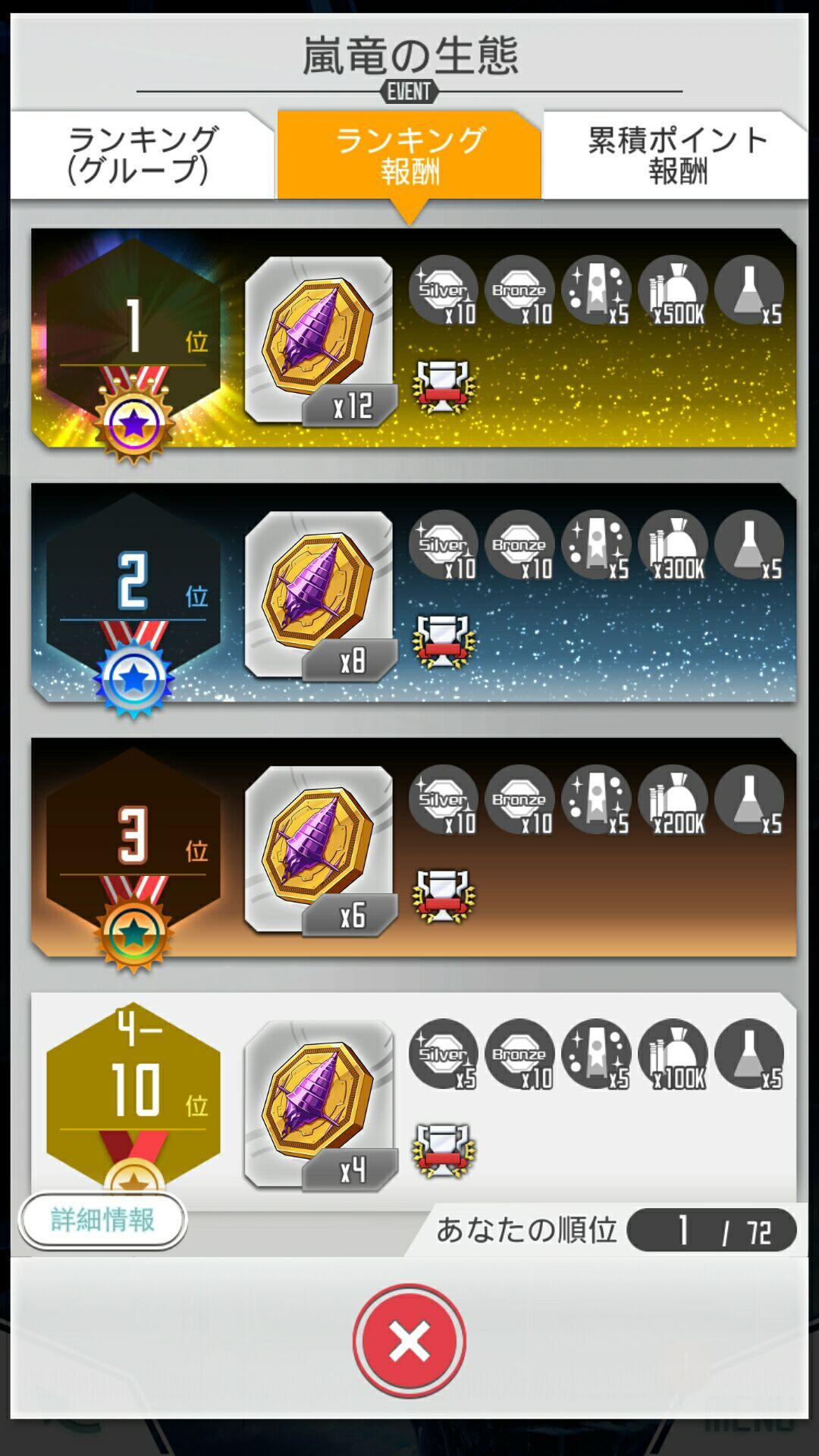 ①这是首次开始使用排名系统。玩家会被分到个个小组,在组内的排名越高奖励越丰厚。这个分组是随机的,运气好100W的分数就第一了。分数是取最高的一关所获得最佳成绩,所以只能打绝级来获得最高的分数。