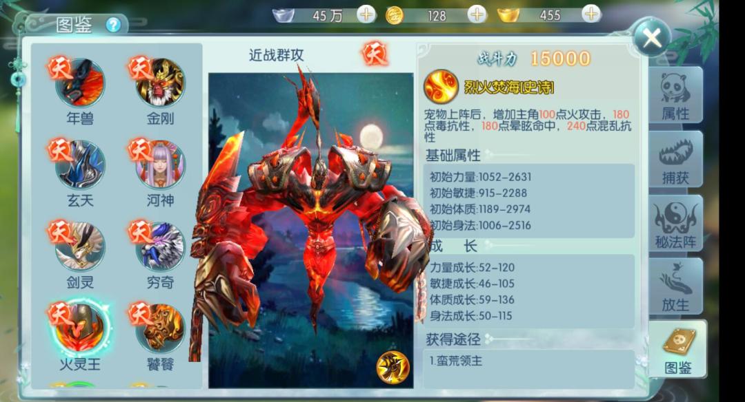 火灵王顾名思义是一个火属性的宠物,宠物上阵后可以增加主角的火攻击,因而适合火属性的狂抢使用。