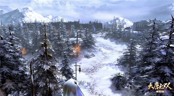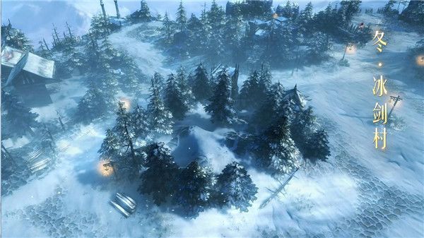 冰剑村地图中,为玩家呈现出一片辽阔的的林海雪原之景象。在莽莽松林密布中还做到了环境通透,而且画面的细节十分精细,哪怕林海之中的一盏灯笼都精细亮相在眼前。