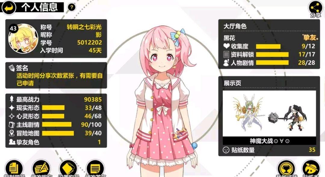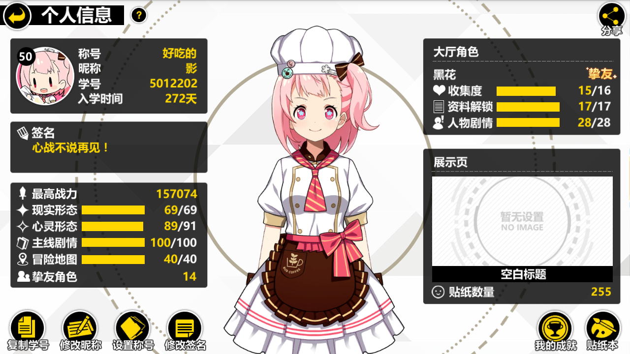 那是2018年8月3号的一天晚上,我刚加完班,拿出点开大妈之家去追新更的别当欧尼酱的漫画,当时被封面的游戏推送画面吸引住了,我于是点开下载了这个游戏,这是我第一次进入心灵世界,就如剧情一样开始的一样-游戏,开始了。但是当我建号进去以后却因为烤土豆的事动弹不得,几次以后我关掉他,第二天本来想去卸载的,结果没狠心还是进去了,依旧是烤土豆,但是磨了一晚上终于过了第一章,当我拿着剧情的奖励和维护补偿进行了两次十连抽,邂逅了我的本命,黑花-美食假日和焦糖女王,带着花花一路推完了剧情,并且放在主阵容里从未拿下。