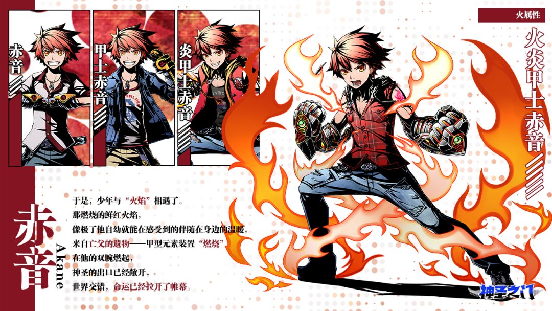 于是,少年与“火焰”相遇了。那燃烧的鲜红火焰,像极了他自幼就能在感受到的伴随在身边的温暖,来自亡父的遗物——甲型元素装置“燃烧”在他的双腕燃起,神圣的出口已经敞开,世界交错,命运已经拉开了帷幕。