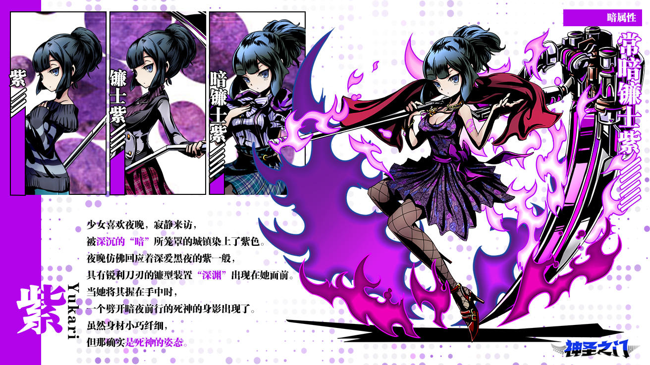 少女喜欢夜晚,寂静来访,被深沉的“暗”所笼罩的城镇染上了紫色。夜晚仿佛回应着深爱黑夜的紫一般,具有锐利刀刃的镰型装置“深渊”出现在她面前。当她将其握在手中时,一个劈开暗夜前行的死神的身影出现了。虽然身材小巧纤细,但那确实是死神的姿态。