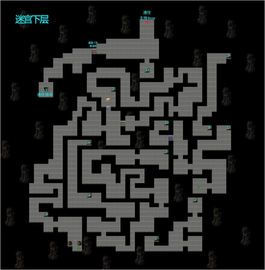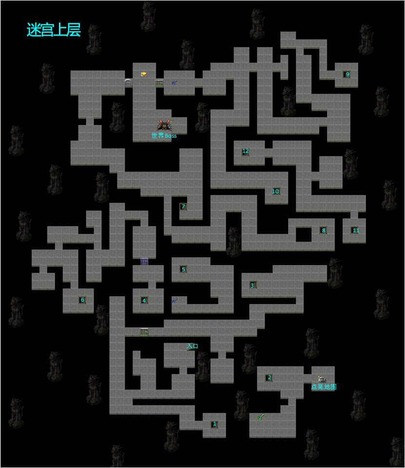 敦煌迷宫实际上分上下两层,通过各处的楼梯上下交错,很容易迷路,下面是迷宫地图以及各楼梯对应的出入口