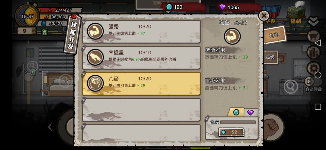 我建议先点5幸运星再点10强身和亢奋后点满幸运星。(上图)