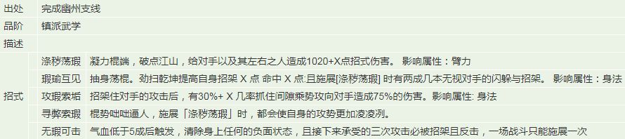 相比烛龙枪诀,臂力加成主动,身法(追击)内息(降防、额外伤害)加成被动,无暇棍法更符合前排定位,同时,上乘野枪百花枪法也是身法加成,就这条路会走的更圆润,不需要洗点也能比较流畅。