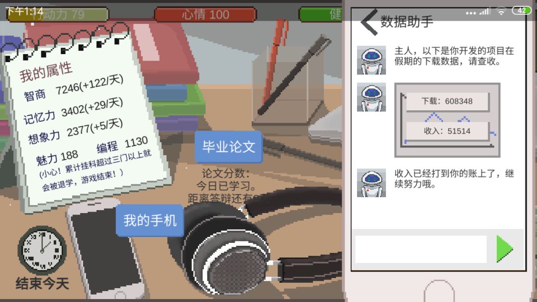 之后你就不用管,选了论文之后,一直补课,反正你有钱。给你们看一下第9天的属性。