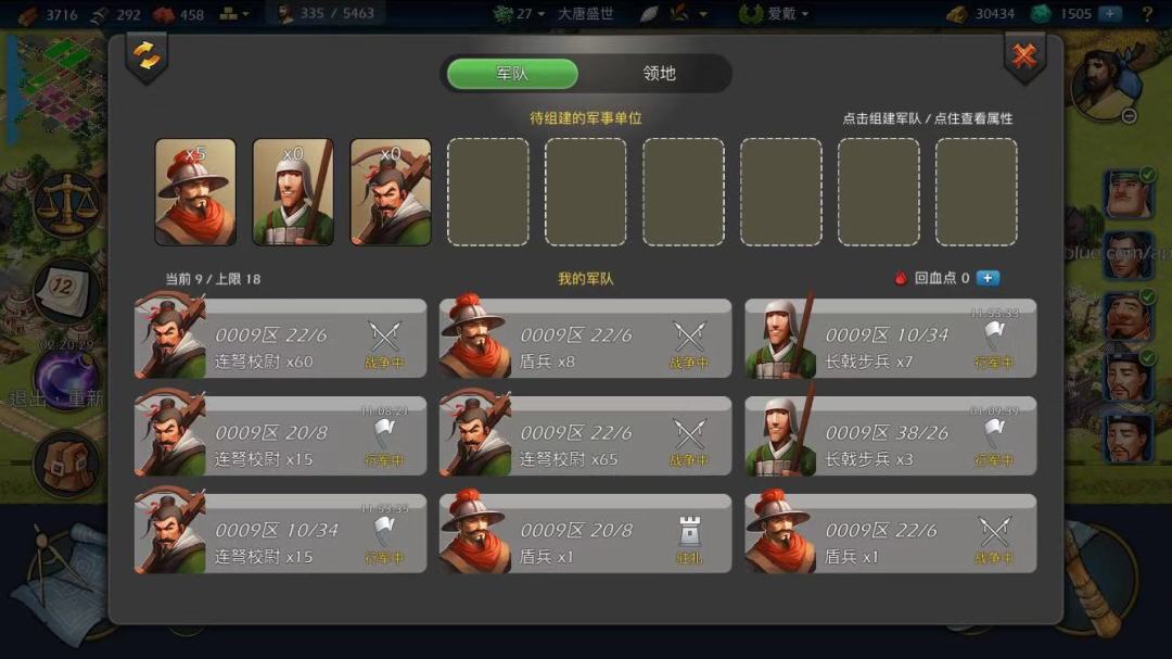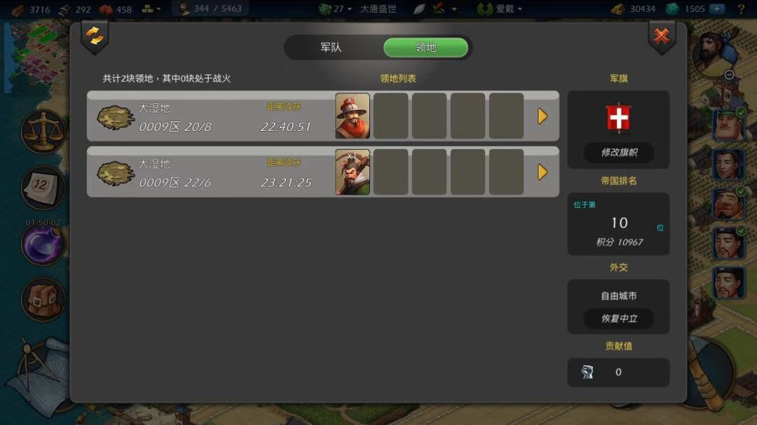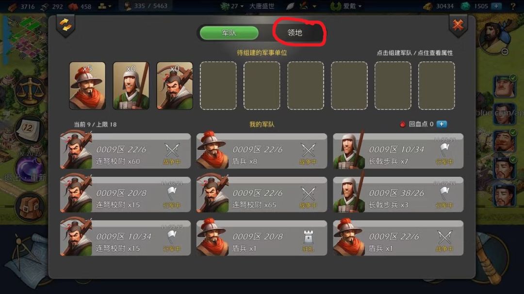 占领野地之后,我们同样在城内的军队界面中可以选择领地概况。