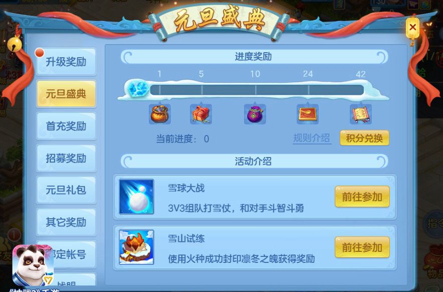 三界少侠完成雪球大战、雪山试练、元旦烟花后即可获得进度分,每人每天每个活动最多获得1点进度分,用于领取阶段性奖励。参与三大活动还可获得活动积分,用于兑换宠物寿命或元旦福袋;打开福袋可得奖励,还有机会获得神兽源生之灵、双人坐骑元神哦!
