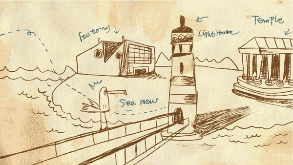 跟一般解谜类游戏操作相同,通过点击来游戏中的人物或道具,会提供有用的信息,《迷失岛》的画面元素均有特殊隐喻,如刚上岛屿看到的灯塔,画面右边的像是巴洛克风格设计的建筑,据开发者说,他是参考北京798艺术园区的建筑,是典型的包豪斯风格。虽然不是艺术科班出身的他,但从设计上这一点,可看出他个性化的一面,游戏中多处设计也让人觉得别有意思。