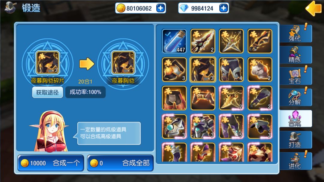 当玩家拥有了足够多的装备碎片后,即可通过合成的功能,将多个碎片合成为一件强力的装备了。除此之外,玩家还可以在合成界面中把各种低等级的物品合成为高级物品。