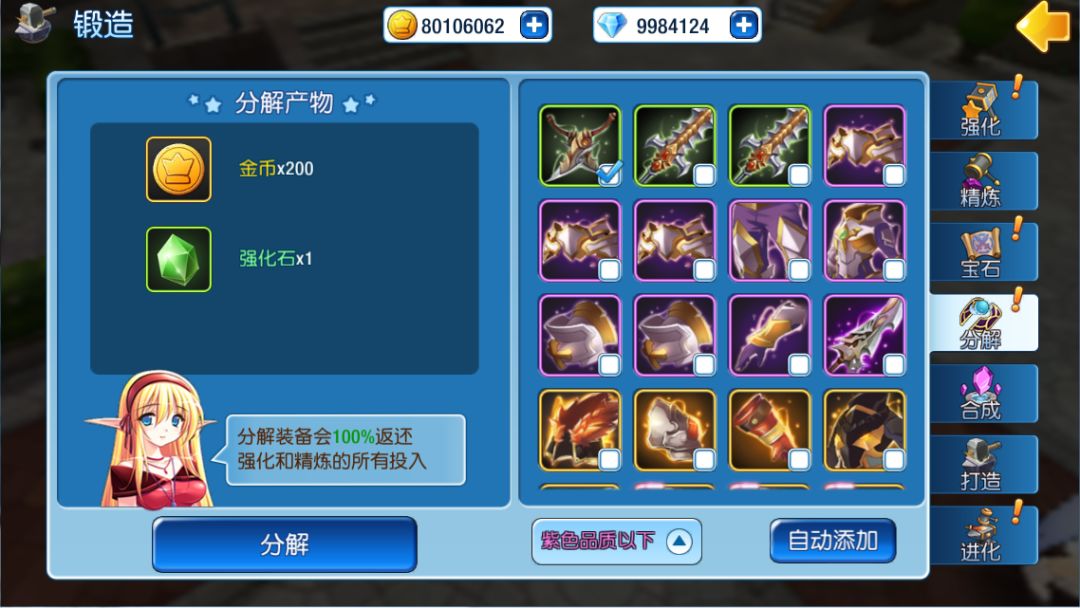 装备分解可以自动添加绿色装备以下的装备进行分解,可以获得对应品质的强化石和金币。