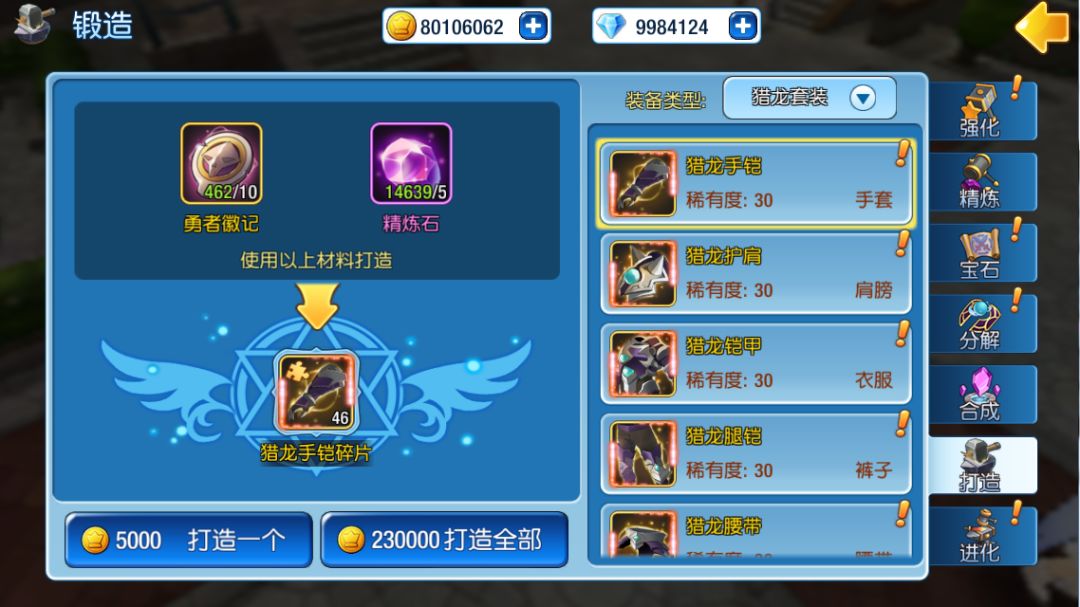 玩家可以通过特殊道具的组合,打造出各种高等级的套装装备碎片,这是高等级装备的核心来源。