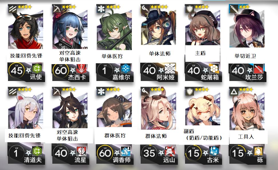 前言:周年庆版本之后越来越多的萌新入坑,介于最近遇到很多提问如何编队的博士,现在以定位的角度介绍萌新前期推图的常规阵容。编队是一个动态的过程,不是说一个队伍可以一直使用,在游戏不断进行的过程中,根据自身卡池的补充,推图所需特定干员的需求而进行的。没有一成不变的队伍,希望看了这篇的萌新可以对编队有一个比较简单的了解,下面我们就开始吧。