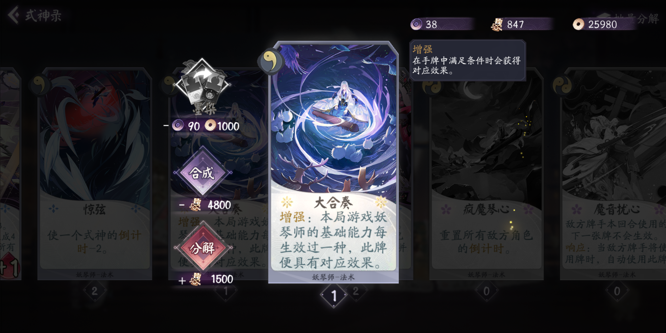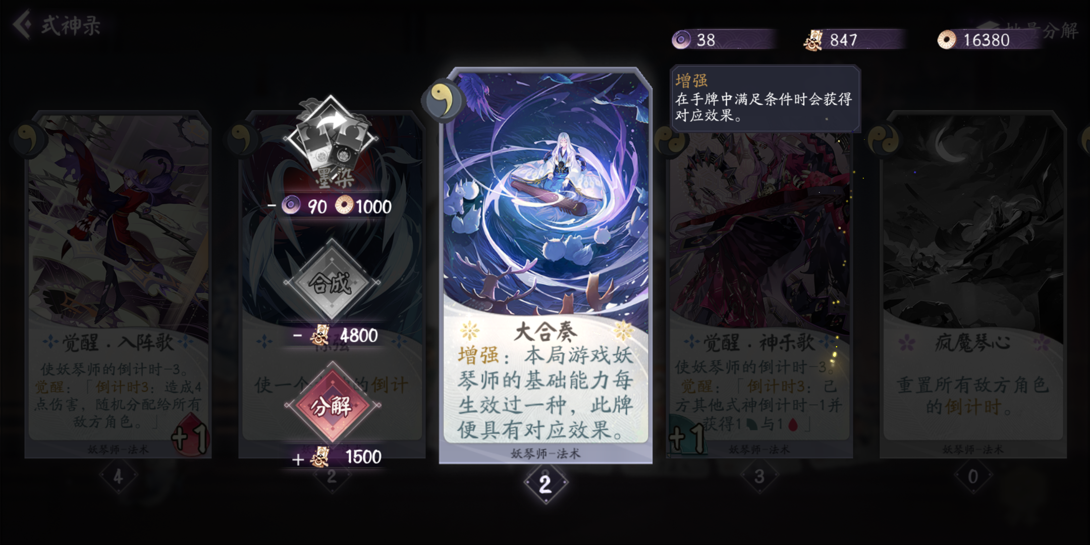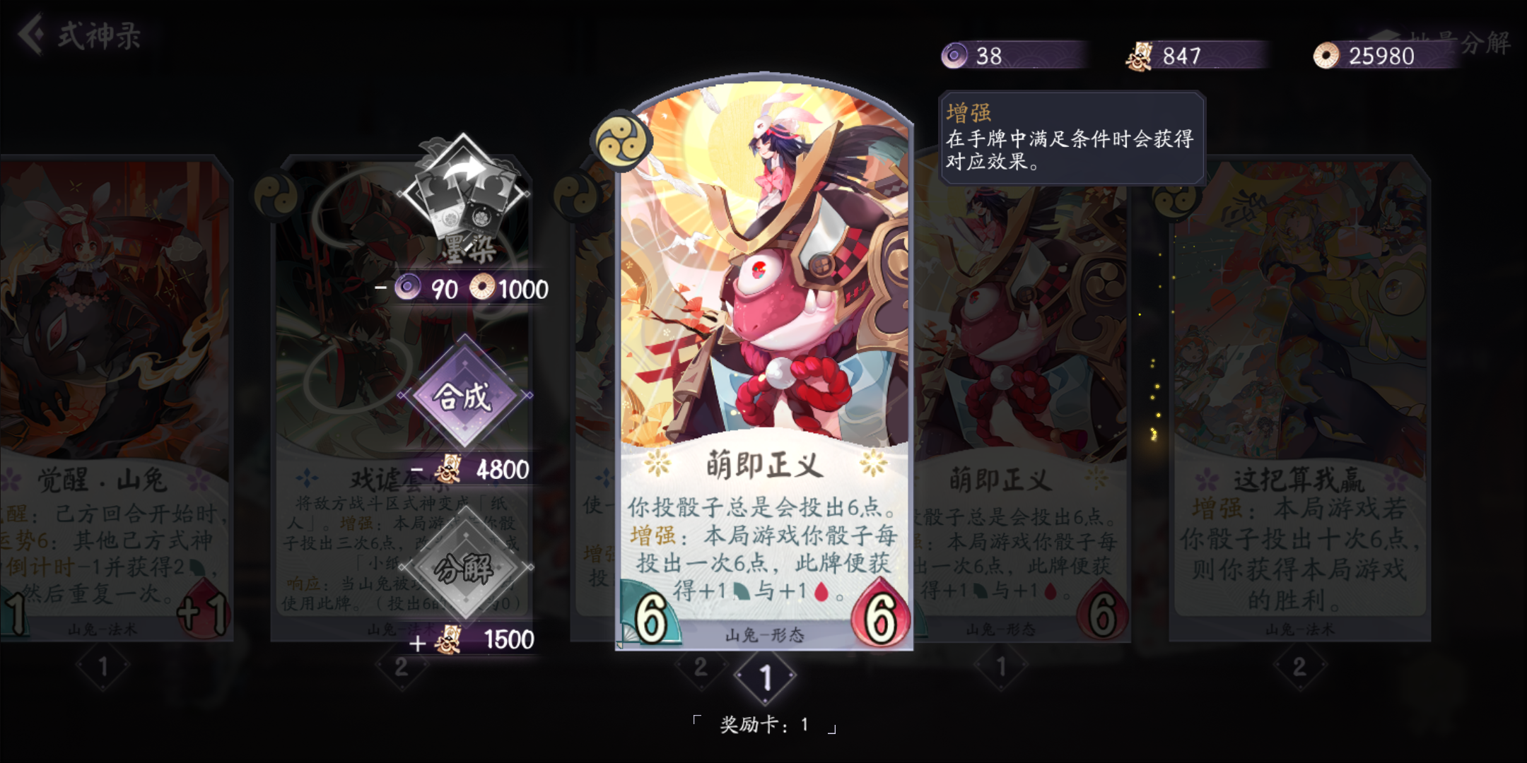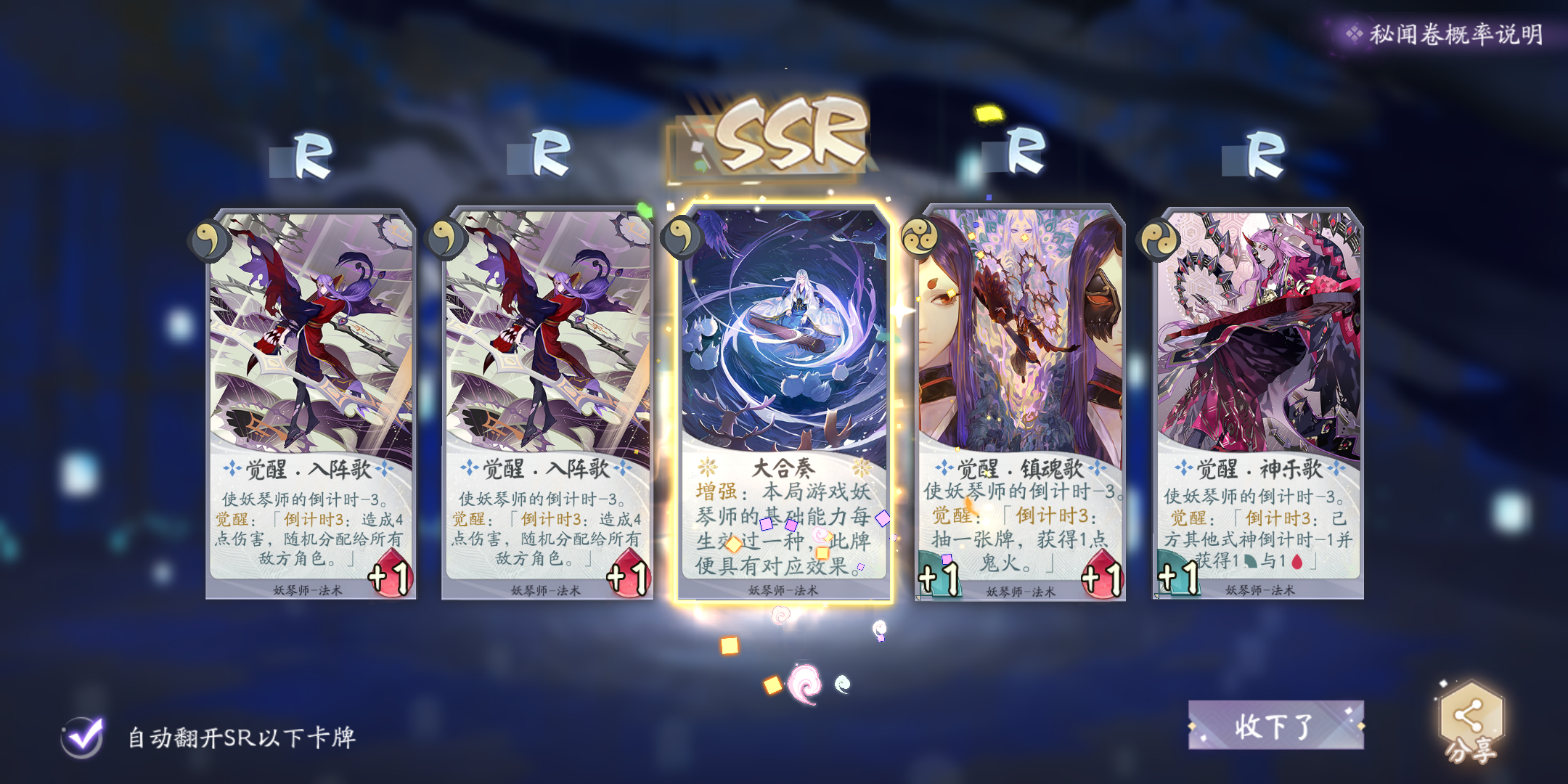还有一个清姬的SSR被我分了做觉醒兔了,一共就抽到过4次,居然还能出来俩一样的,第二个妖琴是刚抽的,还热乎